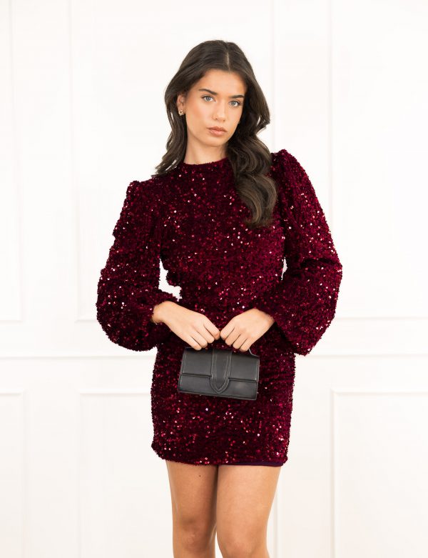 Skyn in hierdie elegante wynrooi rok met sprankelende besonderhede. Perfek vir die feesseisoen of spesiale geleentheid!