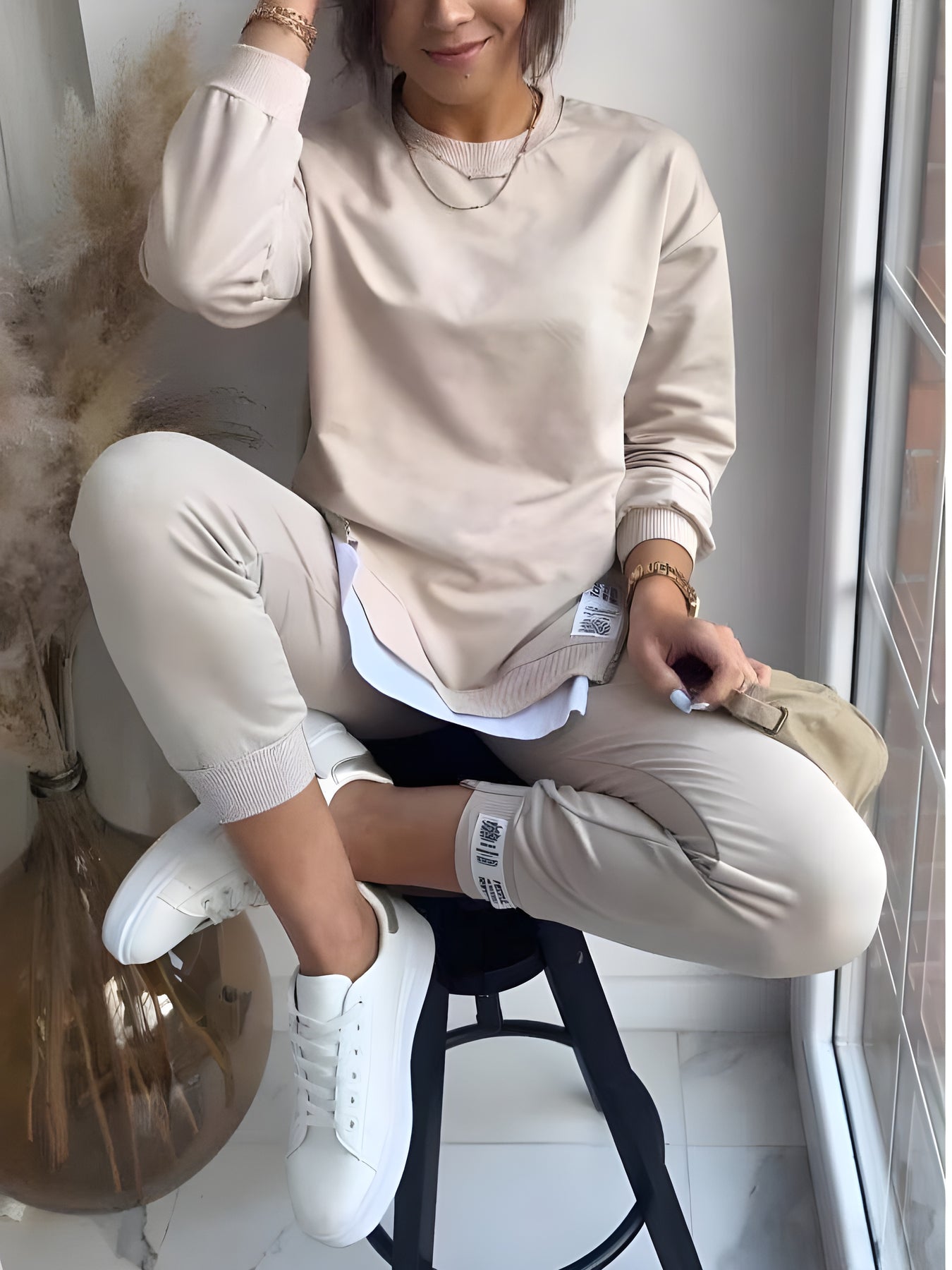 Daardie lospassende trui en taps toelopende broek gee jou 'n moderne, samehangende voorkoms. Perfek vir waar jy gerief wil hê, sonder om styl prys te gee.